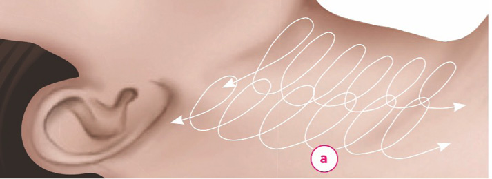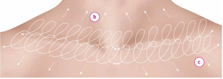 a. Den Kopf der Kundin seitlich legen. Seitlich am Hals hinter dem Kopfwendemuskel beginnen und in langen spiralförmigen Bahnen hoch und wieder herunter arbeiten. Kehlkopf- und Schilddrüsenbereich aussparen. b. Haut am Hals nach oben verschieben und oberhalb des Schlüsselbeins spiralförmige Bewegungen von der Halsgrube bis zum Trapezius ausführen. c. Danach Haut am Hals nach unten verschieben und unterhalb des Schlüsselbeins Spiralbahnen in gleicher Weise ausführen. |