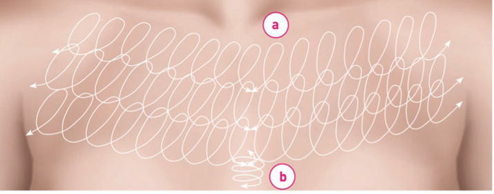 a. Haut durch Zug nach unten spannen. Spiralförmige Bewegungen vom Brustbein zum Schultergelenk ausführen. Von oben nach unten zum Brustansatz arbeiten. b. Brustfalte ggf. intensiver behandeln. |
