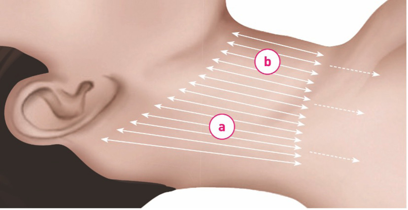 a. Den Kopf der Kundin seitlich legen und die Haut am Hals durch Zug mit der freien Hand nach unten verschieben. Seitlich am Hals hinter dem Kopfwendemuskel beginnen und in langen Bahnen hoch und wieder herunter arbeiten b. Um den Bereich über dem Kehlkopf / der Schilddrüse zu bearbeiten, den Kopf der Kundin mittig lagern und das Kinn leicht nach oben überstrecken lassen. Die Haut durch Zug mit der freien Hand nach unten spannen und in gleichmäßigen Bahnen hoch und wieder herunter arbeiten. Achtung: Auf dem Kehlkopf keinen Druck ausüben! c. Den Kopf wieder seitlich legen. Die Haut nach oben verschieben und den Bereich oberhalb des Schlüsselbeines mit horizontalen Bahnen von der Halsgrube bis oberhalb des Trapezius bearbeiten. d. Im Anschluss die Haut nach unten verschieben und den Bereich unterhalb des Schlüsselbeines von der Mitte bis zum Schultergelenk mit horizontalen Bahnen bearbeiten. |