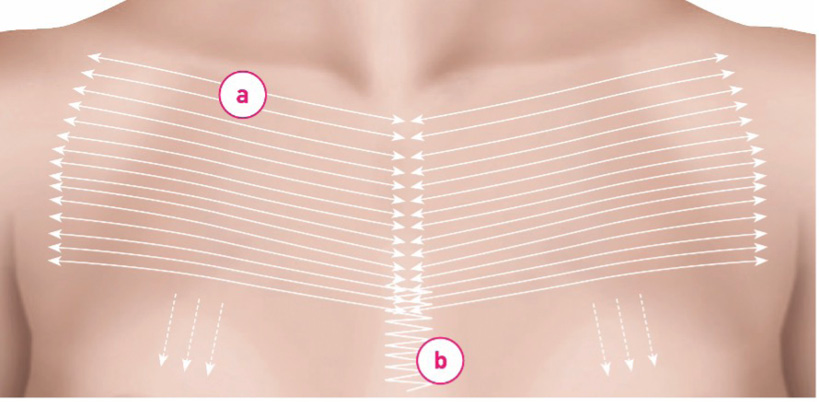a. Die Haut durch Zug nach unten spannen und das Dekolleté vom Brustbein in der Mitte in horizontalen Bahnen bis zum Schultergelenk bearbeiten. Von oben nach unten bis zum Brustansatz arbeiten. b. Ausgeprägte Dekolletéfalten sowie die Brustfalte mit leichten Zickzackbewegungen des Handstücks intensiver nachbehandeln. Abschließend das Gesamtergebnis prüfen und Hautareale nachbearbeiten, die noch nicht intensiv aktiviert erscheinen. |