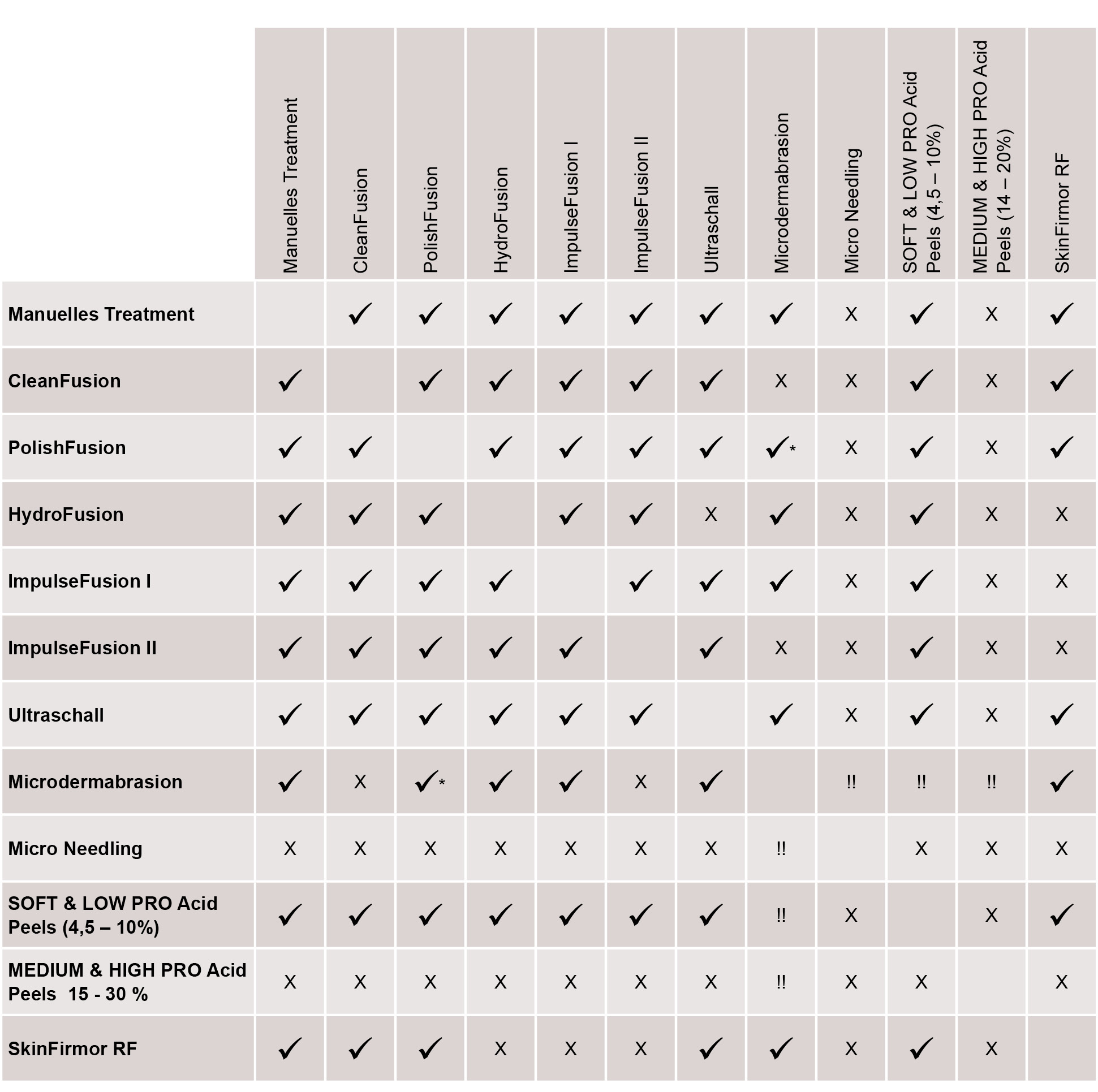 Nachstehende Übersicht zeigt, wie Micro Needling mit anderen BABOR Behandlungen & Anwendungen kombiniert werden kann. Bei allen BABOR DEVICE Kombinationen sind die Besonderheiten der jeweiligen Technologie für eine sichere Anwendung zu beachten. Zudem sind die Empfehlungen im Hinblick auf die Vorbereitung der Haut auf die jeweilige Geräteanwendung als auch die sinnvolle Nachsorge im Anschluss einzuhalten. Detaillierte Informationen dazu sind den jeweiligen DEVICE Guides zu entnehmen. |