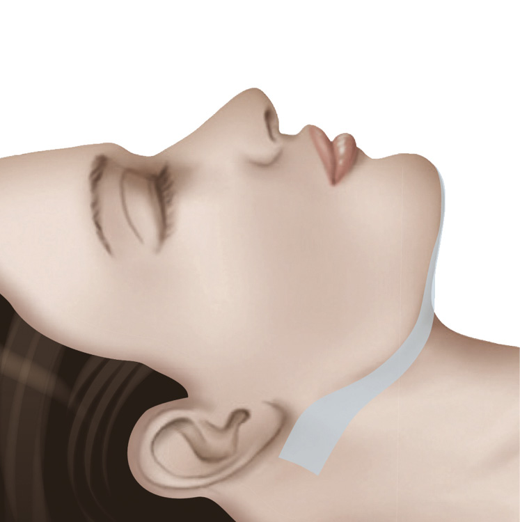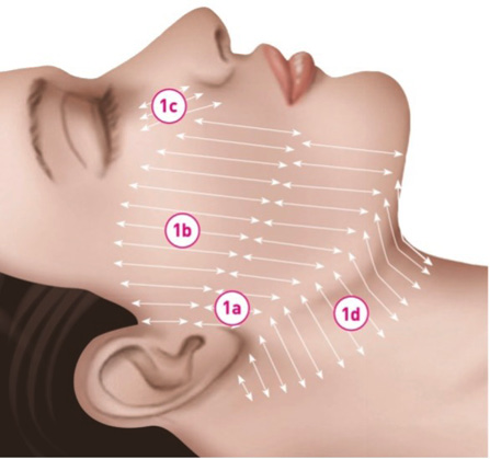 a Seitlich auf der Wange unterhalb des Ohres beginnen und die komplette Wange bis jeweils hoch zum Wangenknochen bearbeiten. Auch den Bereich über der Oberlippe berücksichtigen. b. Den Bereich unter der Kieferleiste und unter dem Kinn bearbeiten. |