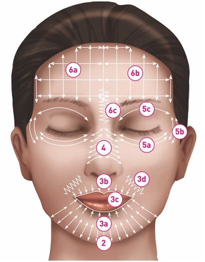 Needling Abschlussmassage – Gesicht 1. Wangen inkl. Kinn und Mundpartie In spiralförmigen Bahnen hoch und wieder herunter arbeiten. |